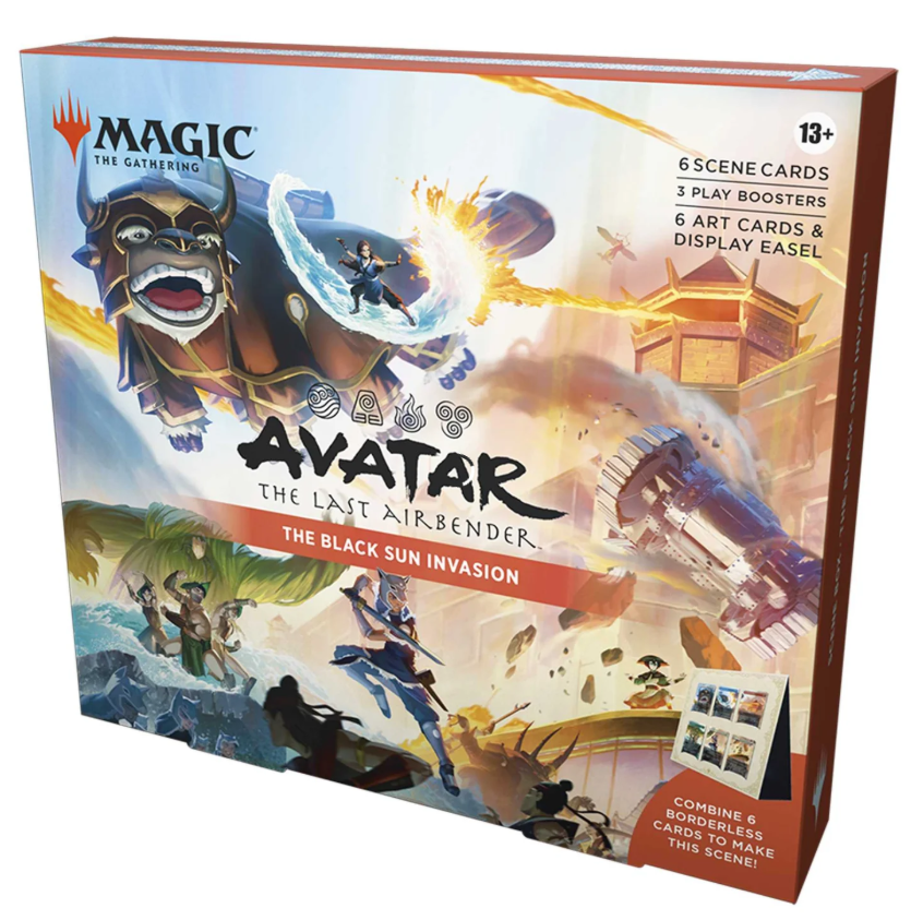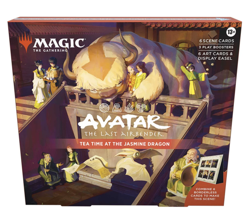 Power up your deck or collection with six borderless scene cards and piece them together to reveal the full story. The Black Sun Invasion Scene Box Team Avatar leads the invasion of the Fire Nation during the solar eclipse. Are they walking into a deadly trap? Tea Time at the Jasmine Dragon Old friends reunite for a cup of jasmine tea at Uncle Iroh's shop. Can friendships last more than one lifetime?