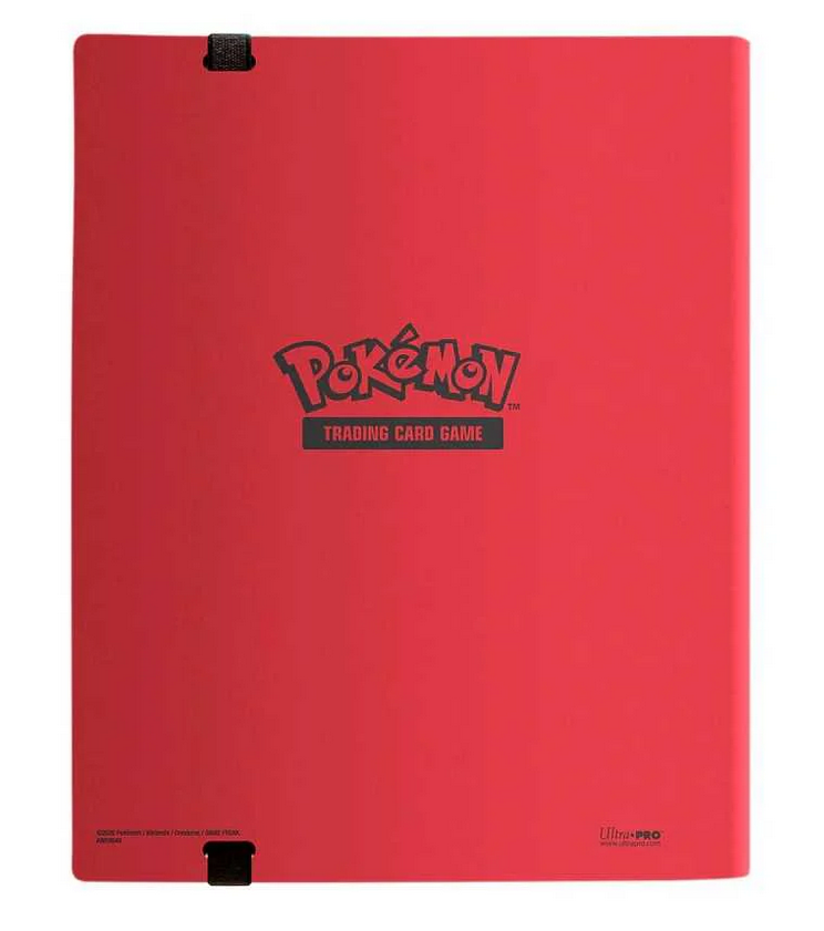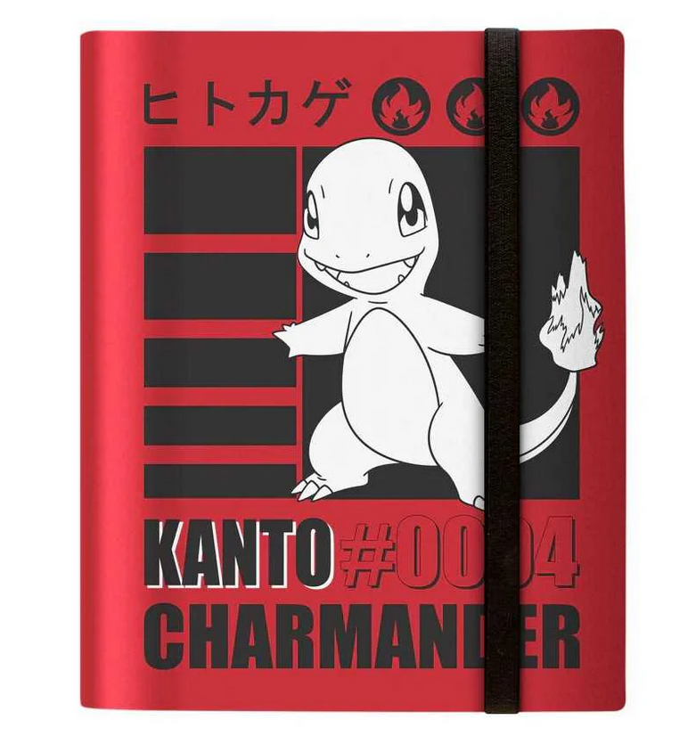 9-Pocket PRO-Binders for Pokémon feature a striking black and white image of Charmander against a vibrant red background and includes an elastic strap closure. Side-loading pockets and low-friction material help keep cards in place. Safely stores up to 360 cards in archival-safe, acid-free, non-PVC pages.